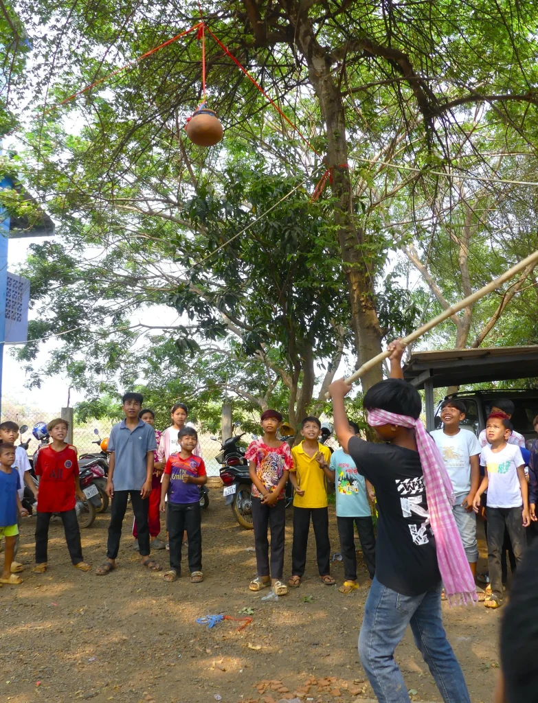 Veay K’aom or Hit the Earthen Pot Game, is a folk game that is popular among all classes, which is played in pagoda grounds during the Khmer New Year. The purpose of this game is to chase away bad things and evil things through the broken pot.